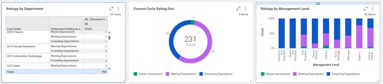 These dashboards provide visibility into how performance ratings are distributed across departments, management levels, and the organization as a whole. They help uncover inconsistencies in how performance is evaluated and ensure expectations are aligned across teams.