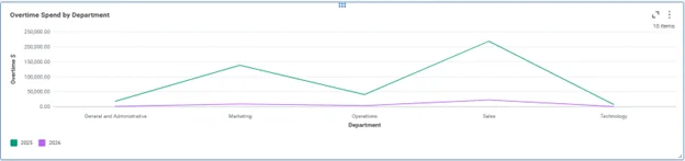 This dashboard highlights where overtime spend is concentrated across departments, helping identify patterns in workload, staffing gaps, or operational inefficiencies. It enables leaders to evaluate whether overtime is being used strategically or if additional headcount would be more effective.
